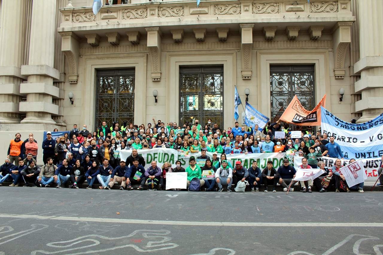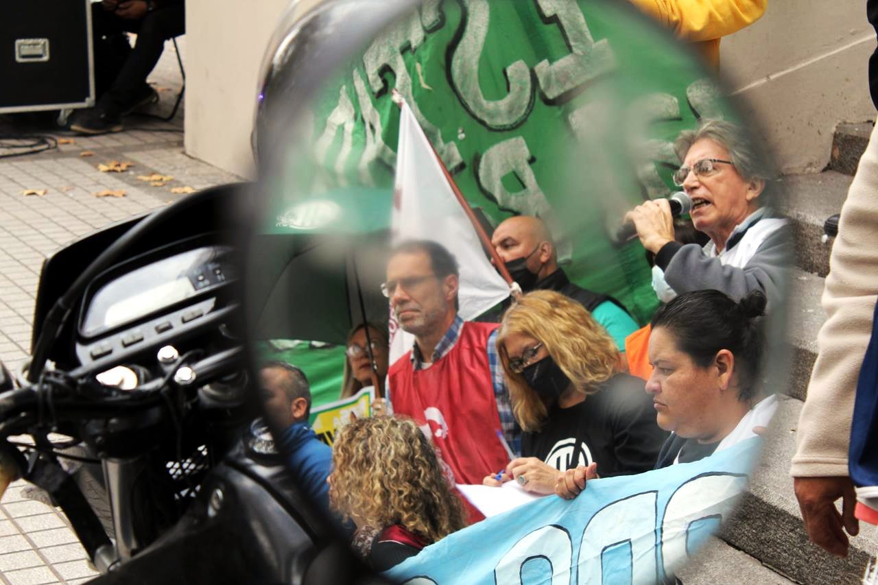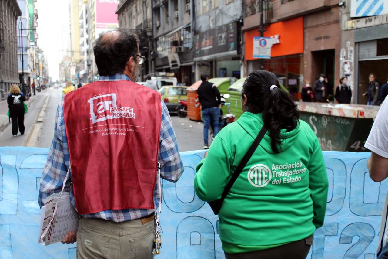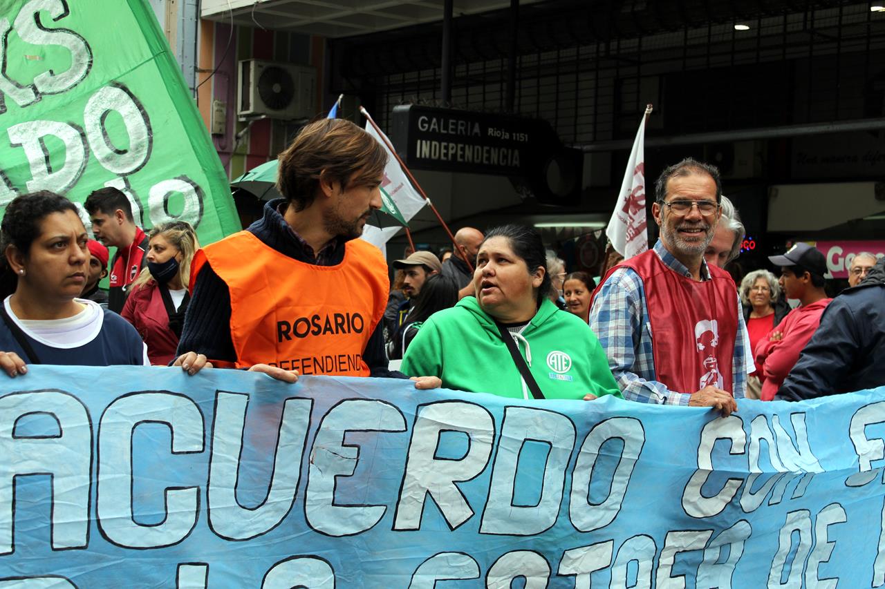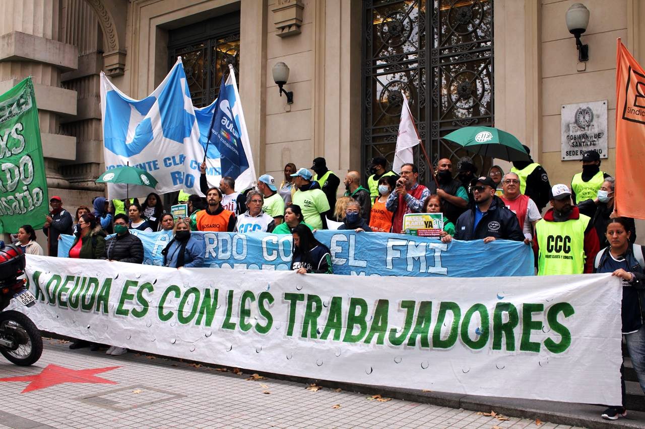 En una mañana nublada en Rosario la esquina del Ministerio de Trabajo se fue poblando de personas. Trapos, pecheras de diversos colores. Bombos y trompetas. Se veían inscripciones de ATE Rosario, Amsafe Rosario, SIPRUS –Fesprosa, COAD, Jaboneros, Aceiteros, la CTAA, la FENAT y la CCC, entre otros. Pero el reclamo era uno: ‘la deuda es con el pueblo, fuera FMI de Argentina’.