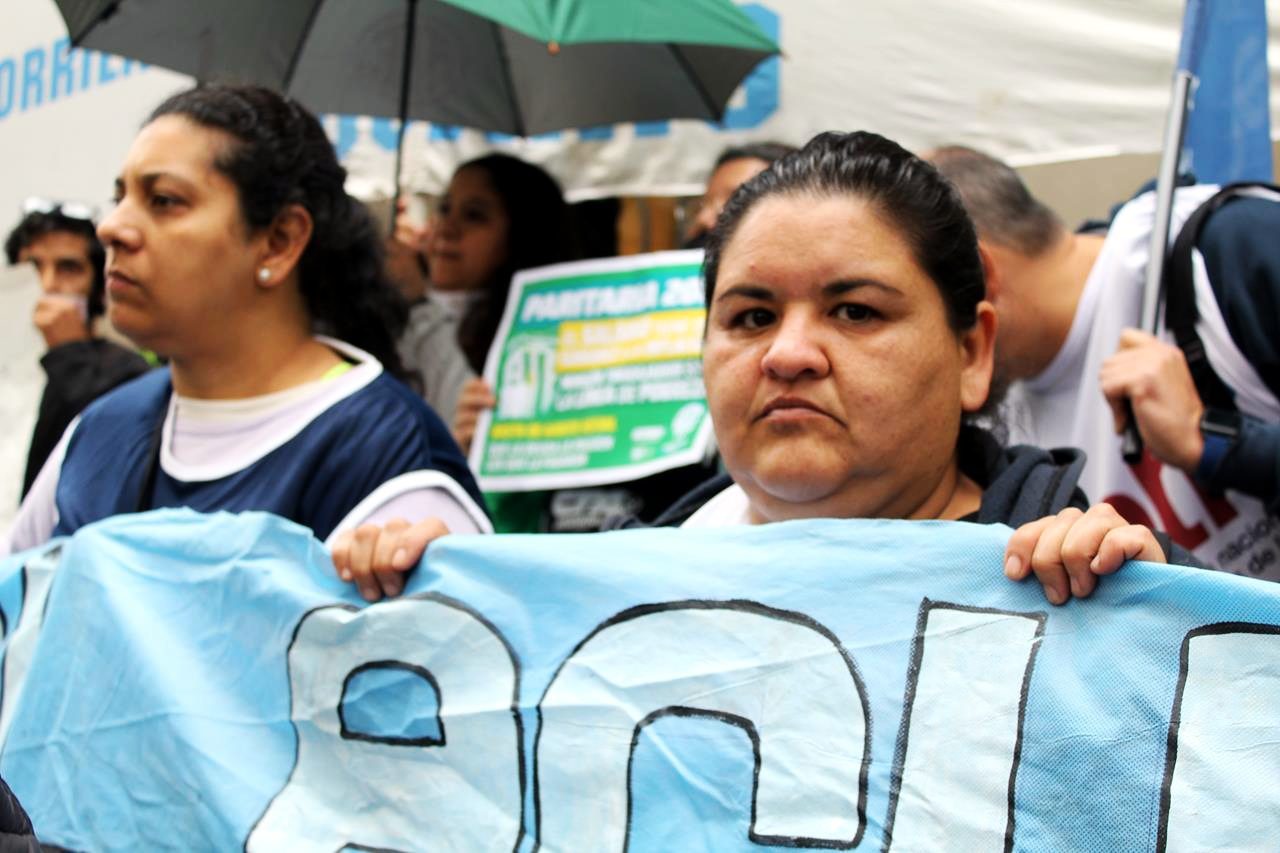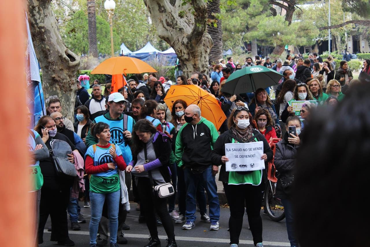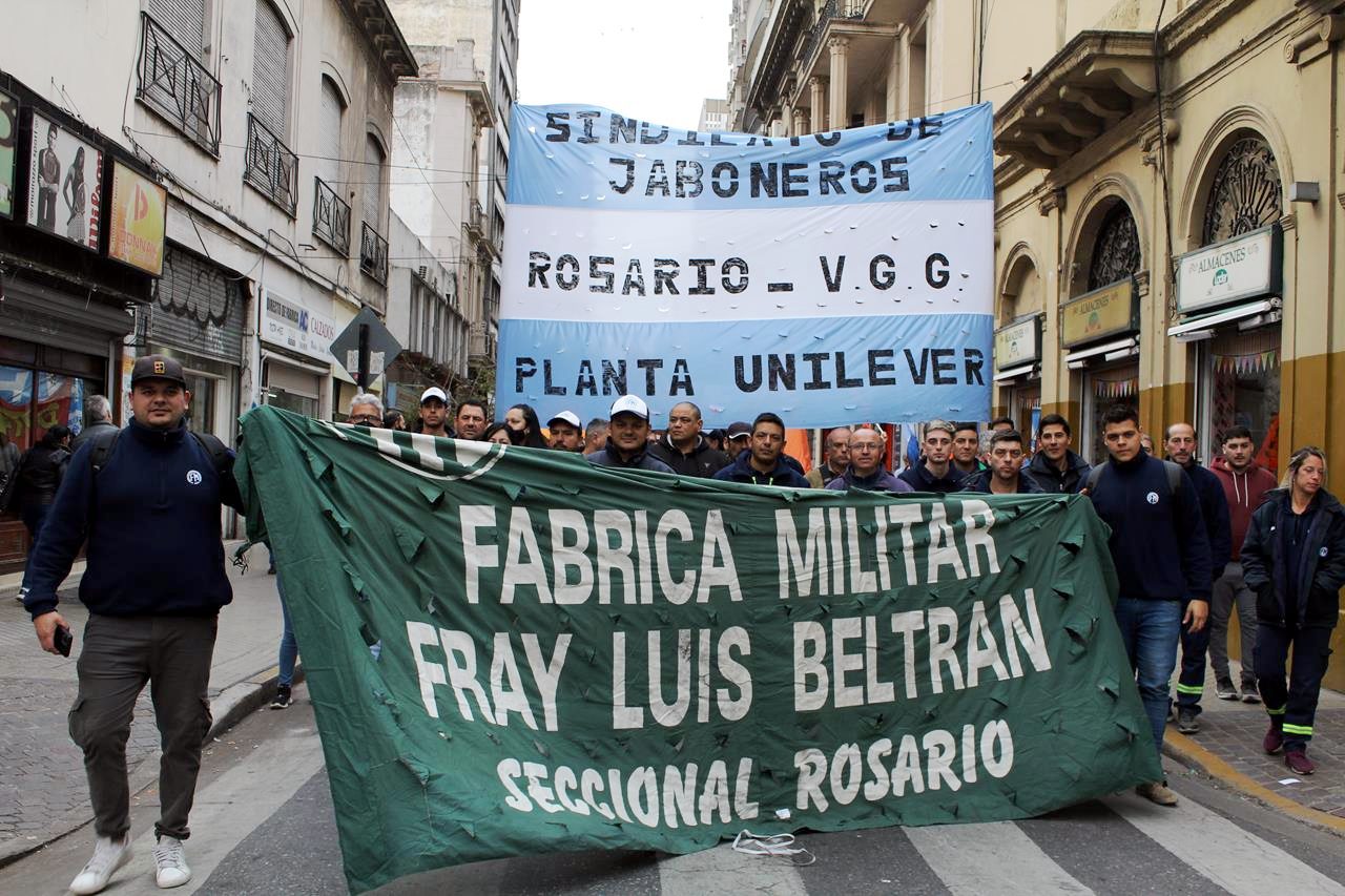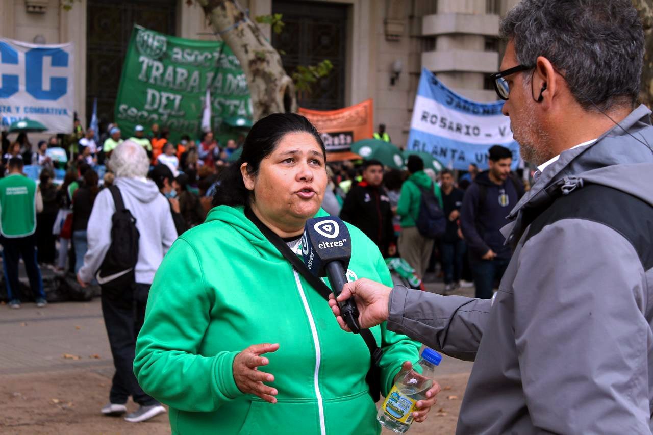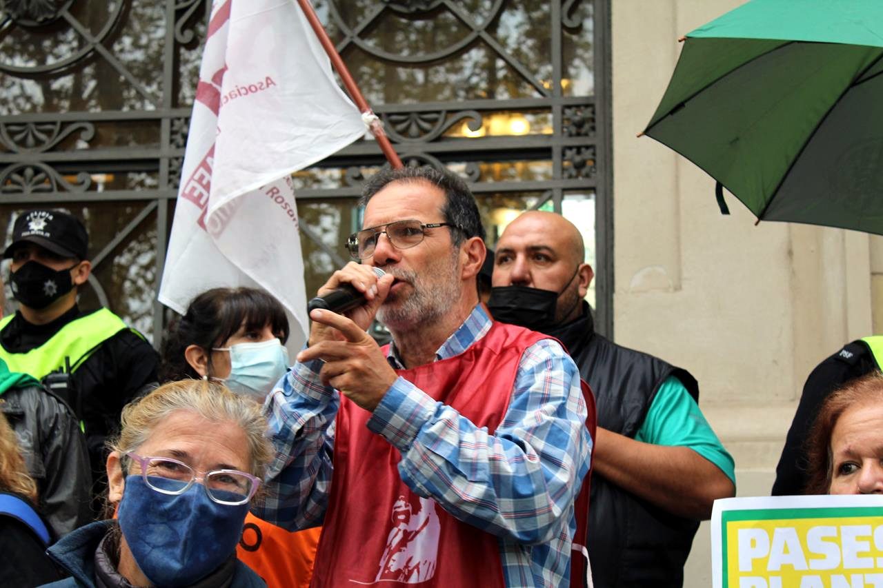 En una mañana nublada en Rosario la esquina del Ministerio de Trabajo se fue poblando de personas. Trapos, pecheras de diversos colores. Bombos y trompetas. Se veían inscripciones de ATE Rosario, Amsafe Rosario, SIPRUS –Fesprosa, COAD, Jaboneros, Aceiteros, la CTAA, la FENAT y la CCC, entre otros. Pero el reclamo era uno: ‘la deuda es con el pueblo, fuera FMI de Argentina’.