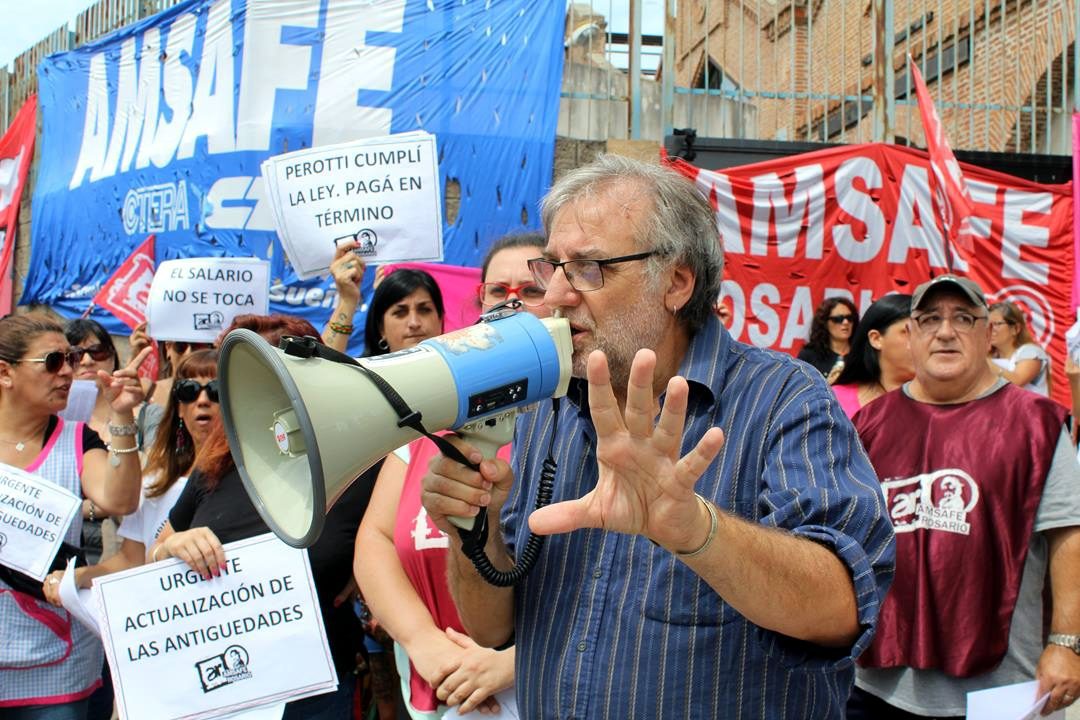 En un nuevo acto unitario, los sindicatos y la CTA Autónoma local se pronunciaron contra “la voluntad política de ajuste”, que expresa la decisión del Gobernador Omar Perotti en torno a la prórroga del pago de salarios hasta mediados de mes. “Es una definición desleal, corta el hilo por lo más delgado. Y agarra a los docentes y a los empleados públicos en un momento de vulnerabilidad, donde se están preparando para ir de vacaciones y no pueden afrontar el pago de alquileres, el pago de servicios, el corte de la tarjeta”, dijo el Secretario General de AMSAFE y CTA Autónoma Regional Rosario, Gustavo Terés.