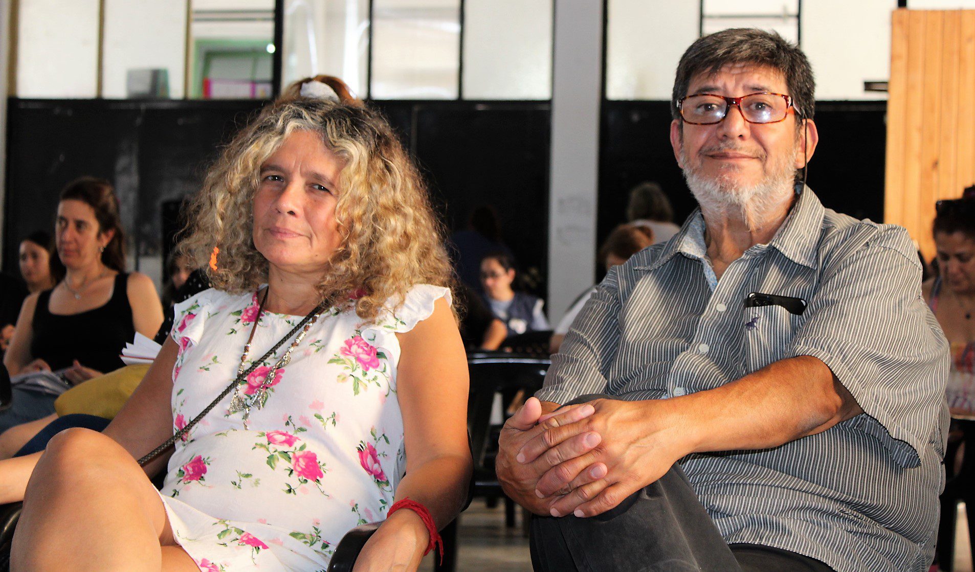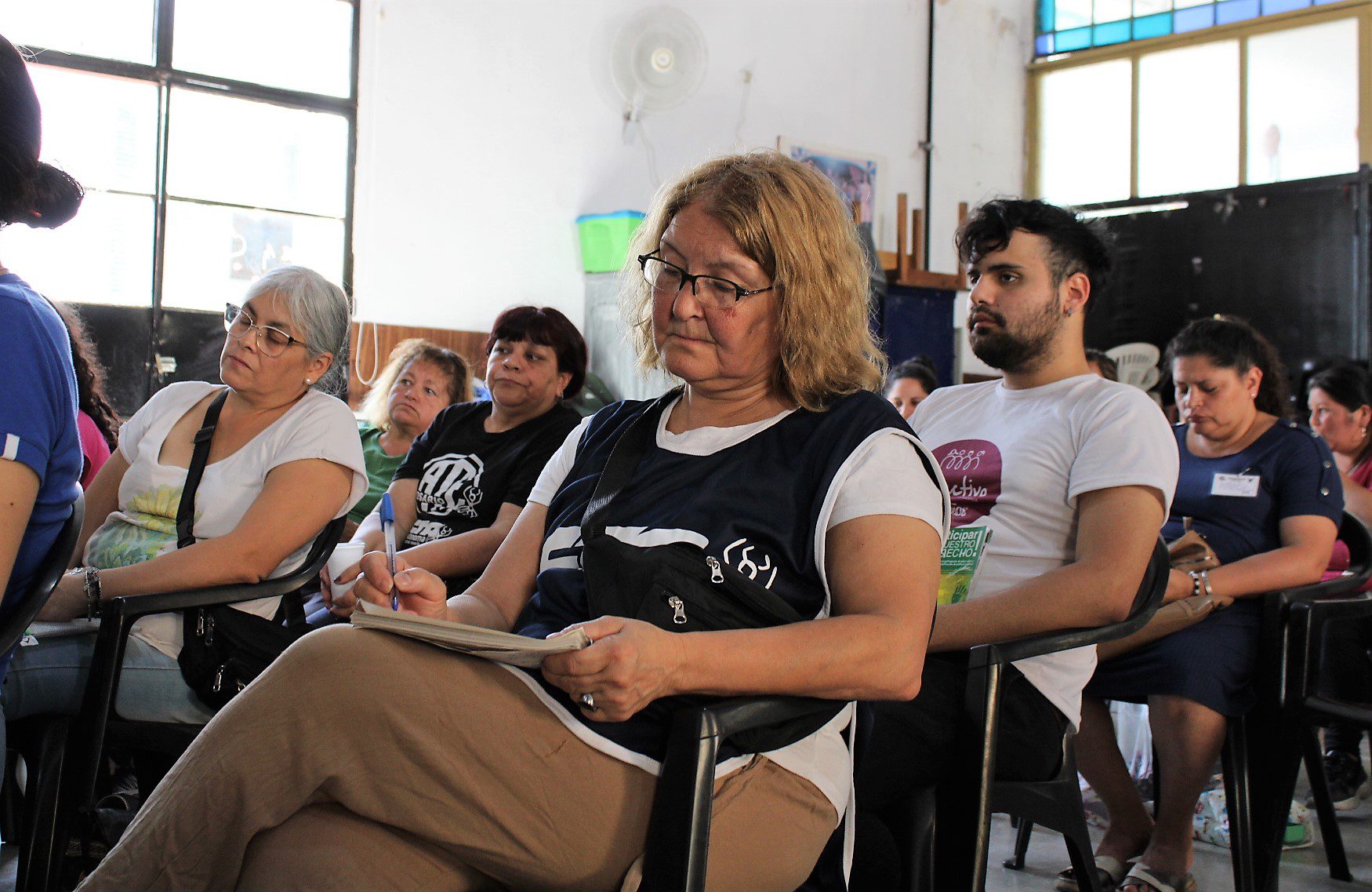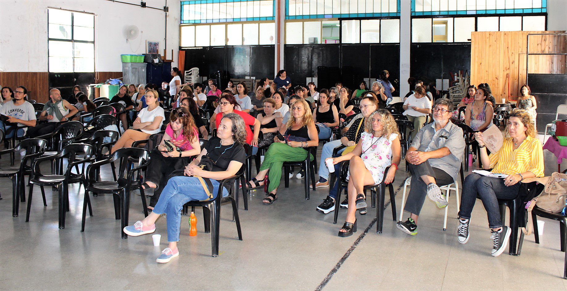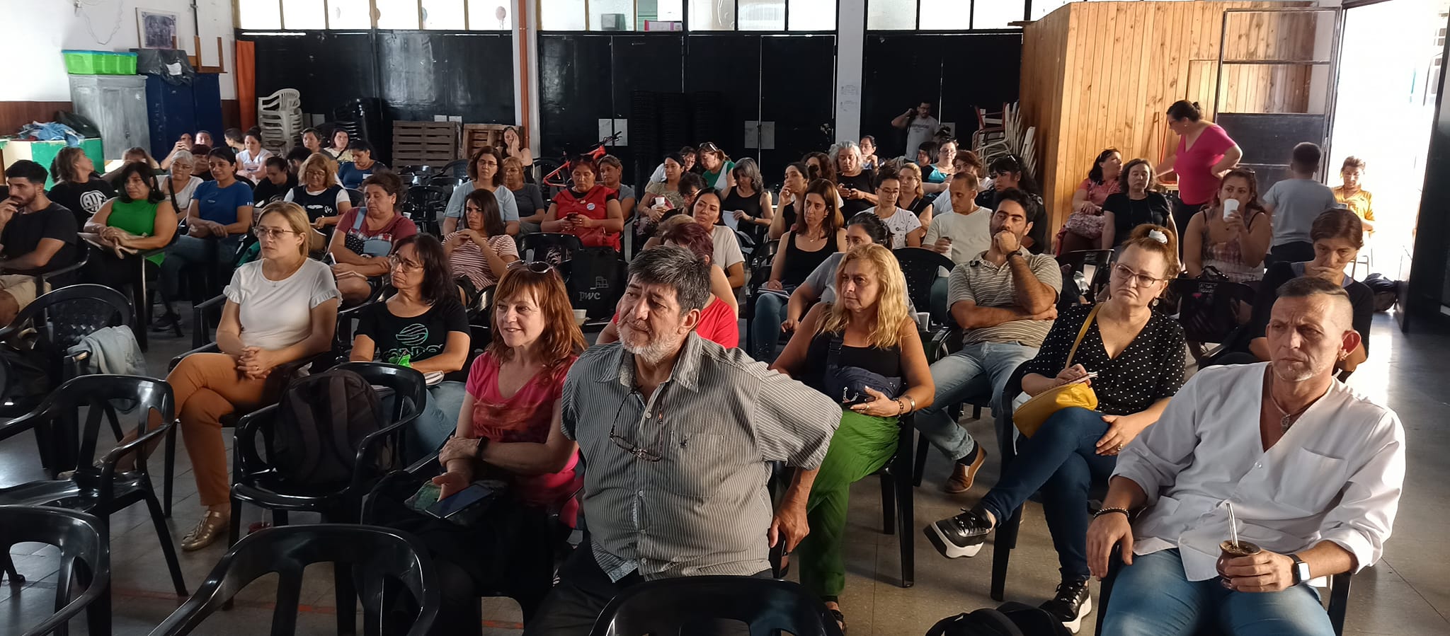 Docentes , asistentes escolares, gastronómicos, trabajadorxs del aáre de la niñez, municipales, El Hormiguero – CTAA, se sumaron en la Escuela Almafuerte a la disertación del coordinador de trabajo social de base y docente jubilado, Oscar Lupori, y de la politóloga Lorena Burgos, de la Secretaría Nacional de Niñez, Adolescencia y Familia.