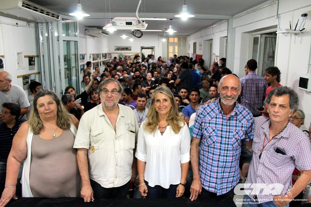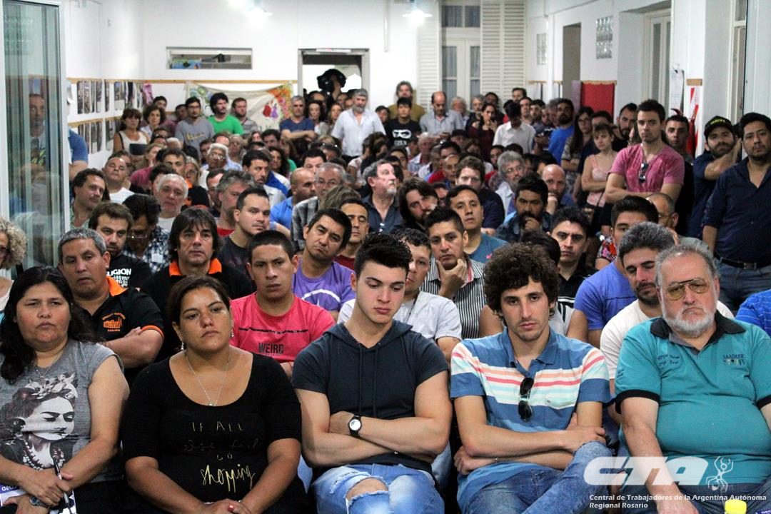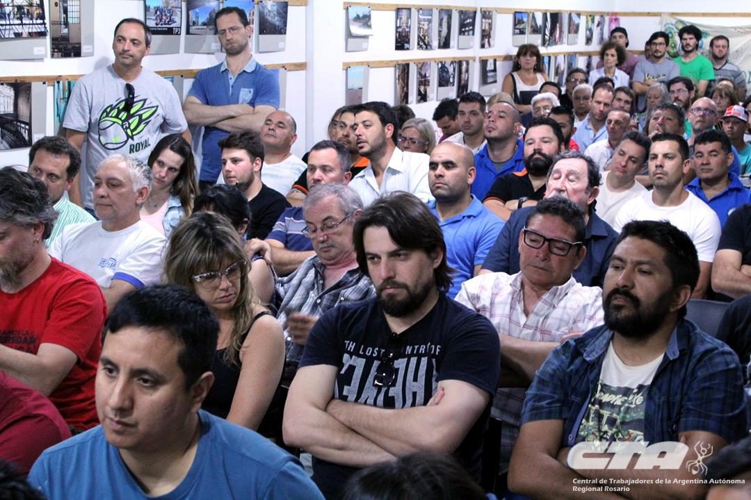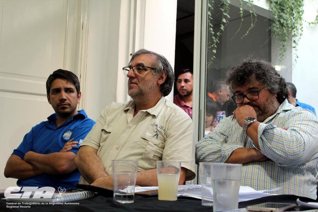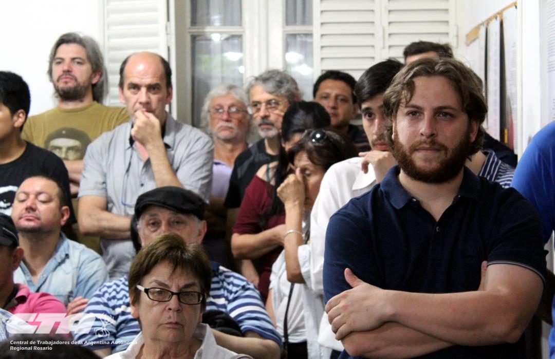 La mesa presidida por los Secretarios Generales Gustavo Terés de la CTA Rosario; Gustavo Martínez, de la CTAA Provincial; Laura Ferrer, de COAD; y Matías Rodríguez del Sindicato de Jaboneros de Rosario y Villa Gobernador Gálvez, miraba a una gran concurrencia de trabajadores jóvenes que generó, incluso, que muchas personas quedaran fuera del salón.