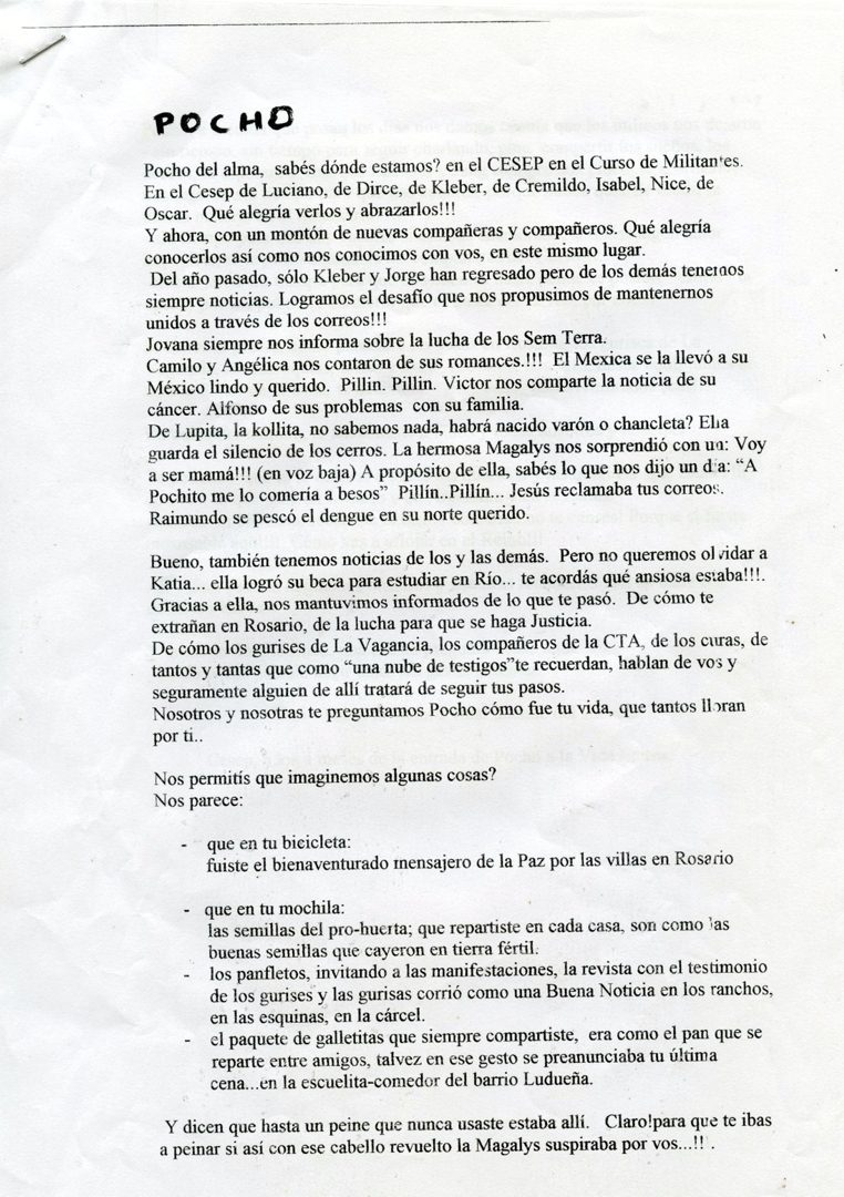 Fue muy duro, cinco meses después de compartir casi un mes de convivencia con Claudio, enterarse de su asesinato. Hay una carta entrañable (ver abajo) que el colectivo que estuvo con él en San Pablo escribió con tal afecto que emociona. Volanin recordó que Pocho “vivía con sus pelos desacomodados. Era una persona muy respetuosa y querida por todo el grupo. Deja su legado de militancia política, por su lucha que le costó la vida, es un ejemplo, un mártir de la militancia”. Para el referente del Ceseep “Pocho vive, la lucha sigue. Inclusive aquí e Brasil Pocho es muy recordado y su legado nos da impulso para que sigamos luchando”.