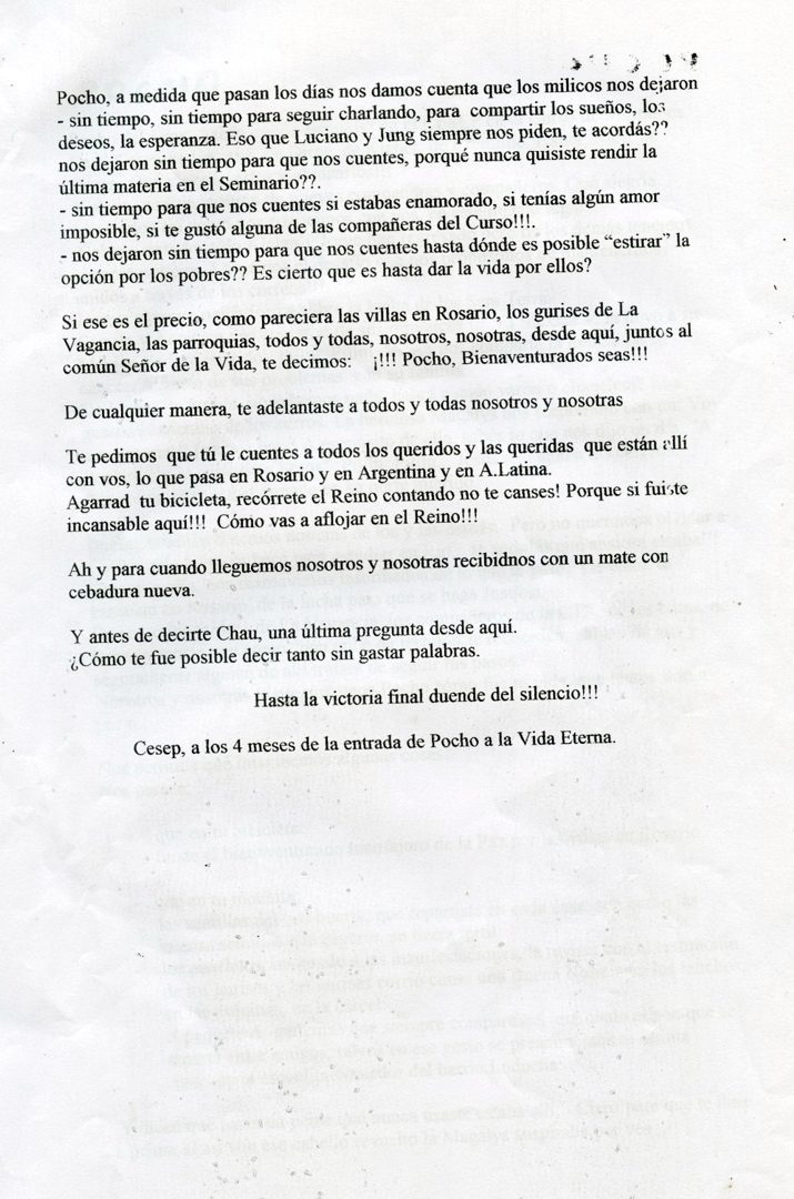 “Pocho se tornó tan presente, porque muchas veces se hizo en su memoria el mismo taller para militantes cristianos que compartió. Cuando supimos su muerte nos tocó muy fuerte aquí, especialmente al grupo de 32 personas que compartieron con él. Muchas personas siguieron escribiendo para Ceseep y enviando testimonios sobre él”, contó Cremildo.