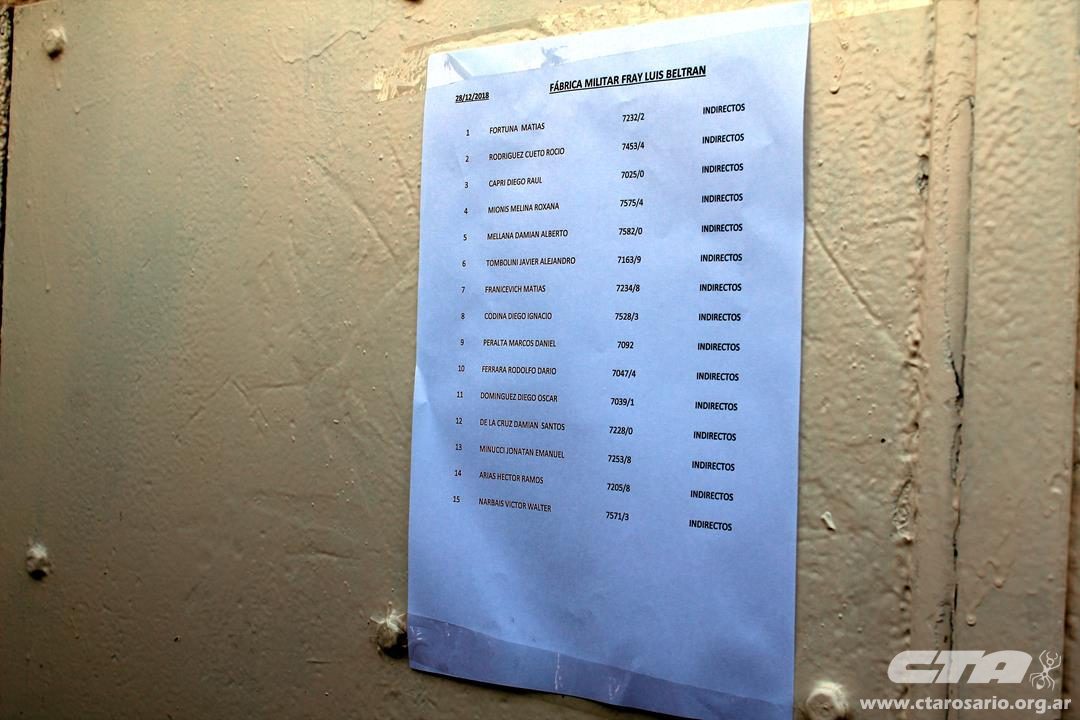 Por Sofía Alberti* | Esta mañana, tras una larga espera, se pegó en el portón de ingreso de Fábrica Militar Fray Luis Beltrán el listado de despedidos y despedidas. La disposición afectó 49 trabajadores a nivel nacional de los cuales 15 son de la fábrica santafesina. Habrá movilización nacional el próximo jueves.