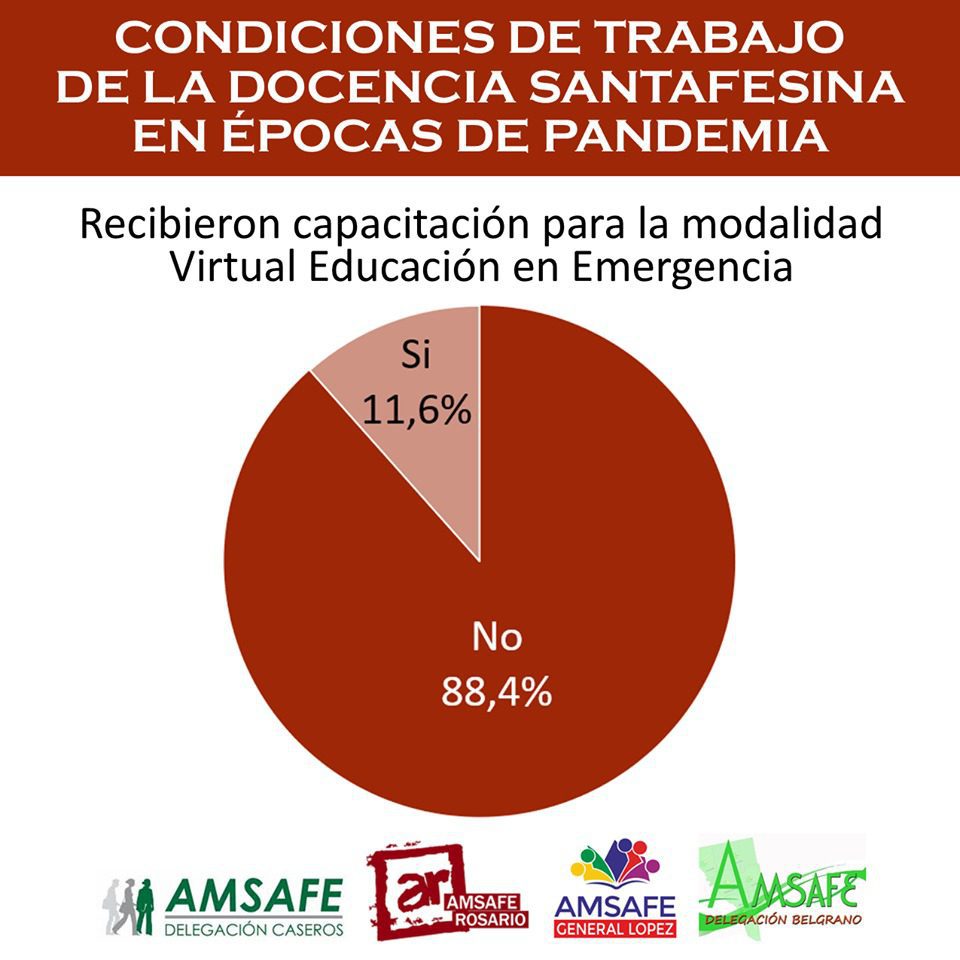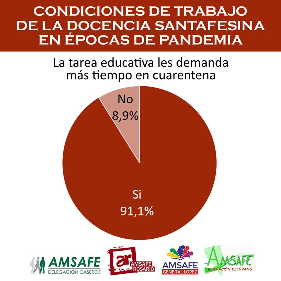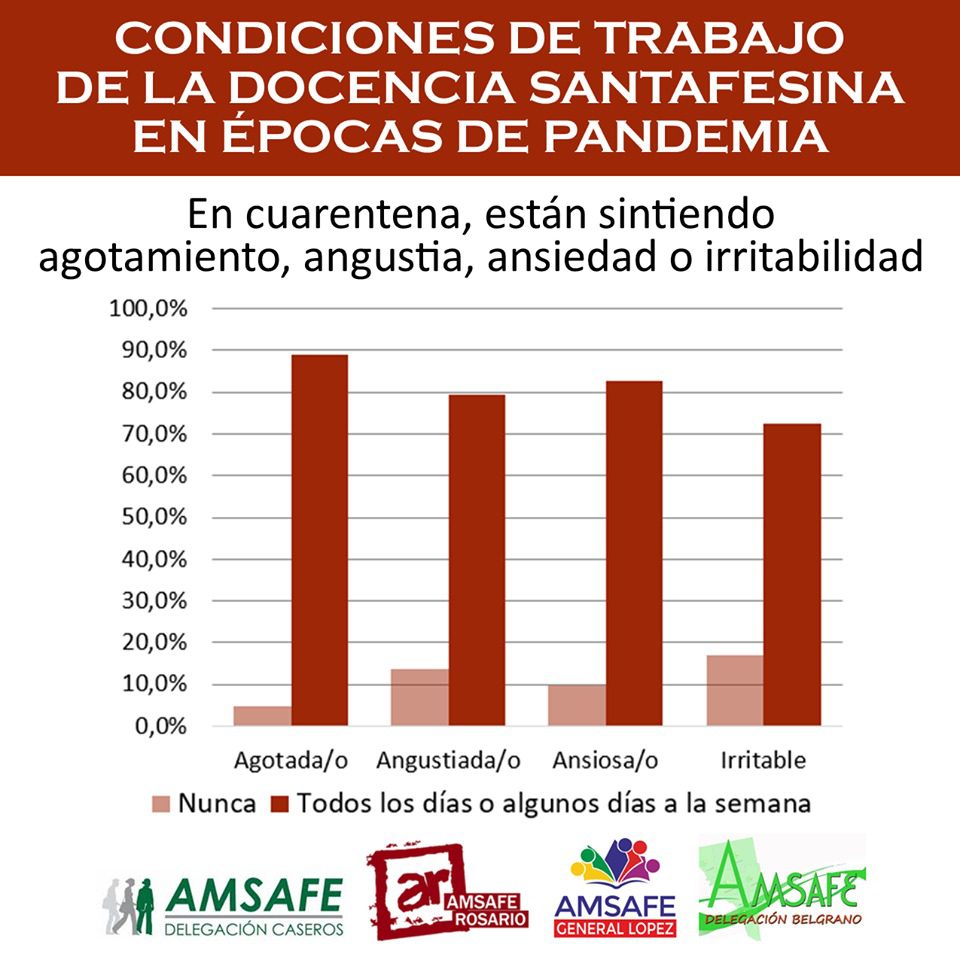 Amsafe Rosario también realizó una encuesta con resultados contundentes. “Sobre una gran cantidad de respuestas recibidas desde todo el territorio santafesino se puede comprobar el impacto sobre las condiciones de trabajo que deben afrontar las y los docentes en esta etapa de aislamiento obligatorio, con graves consecuencias sobre su salud física y mental. Los resultados muestran la gravedad del deterioro en las condiciones de trabajo”, expresaron desde la delegación del gremio docente.