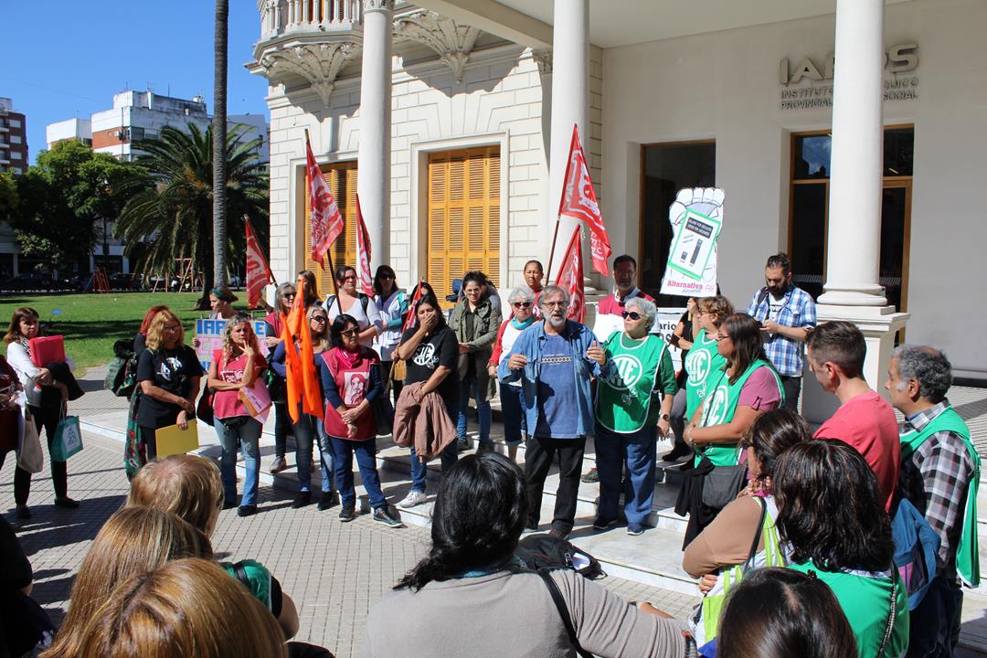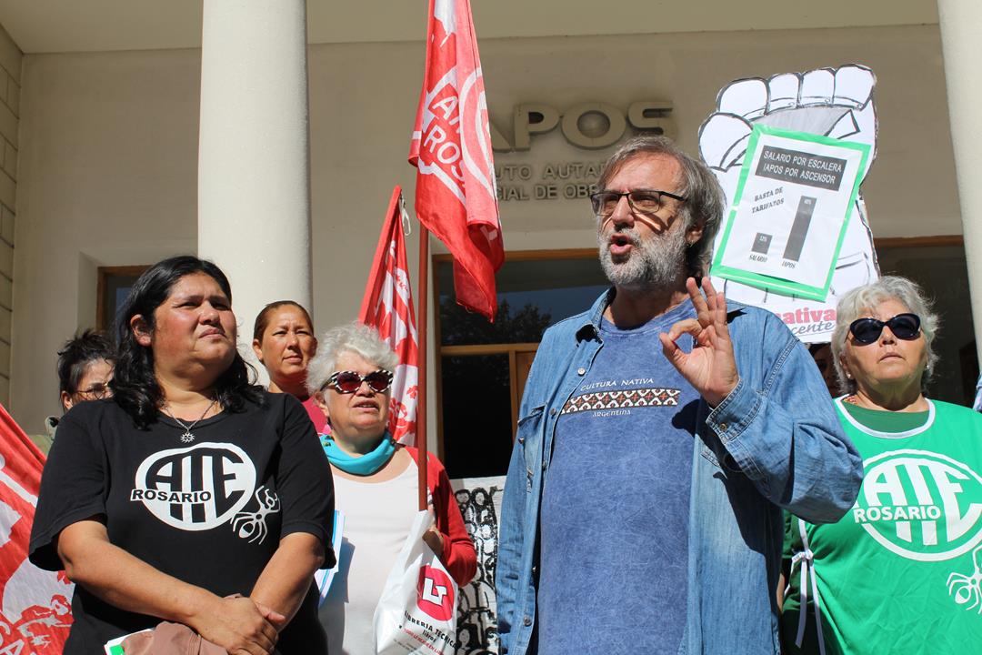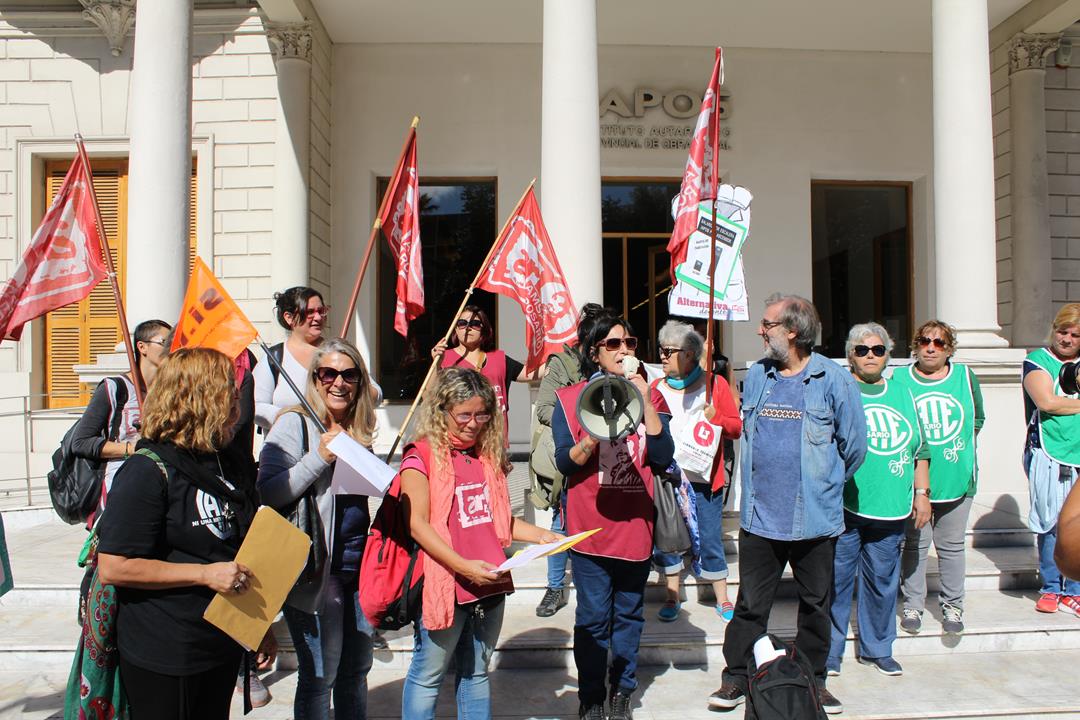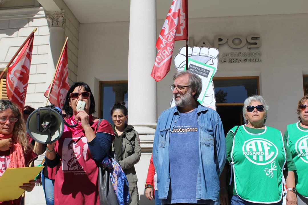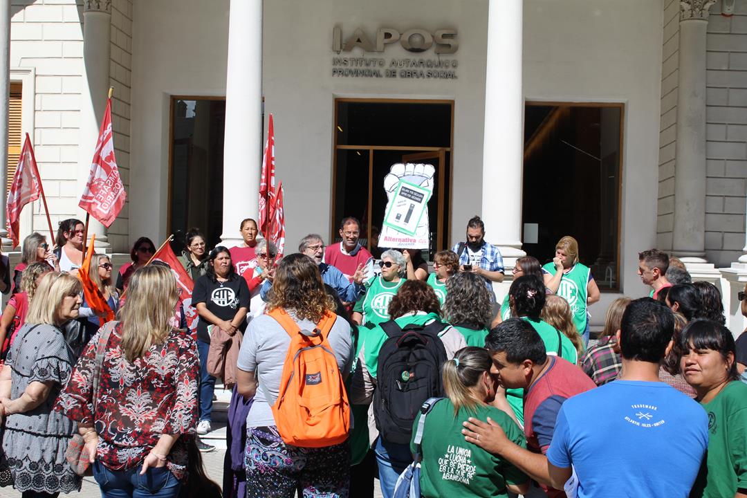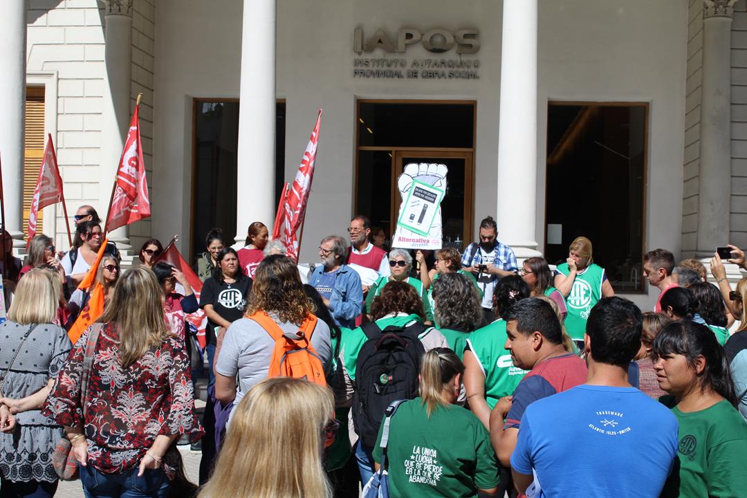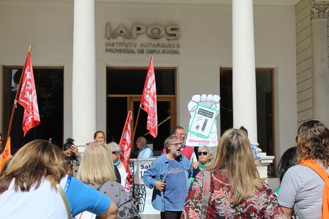 Amsafe Rosario, ATE Rosario y SIPRUS se manifestaron frente a las oficinas de IAPOS el miércoles al mediodía. Realizaron un acto y entregaron una nota de reclamo a las autoridades para que se retrotraigan inmediatamente las disposiciones. Además, denunciaron que la primera acción fue culpar a los trabajadores de IAPOS que dieron aviso a los gremios de la situación.