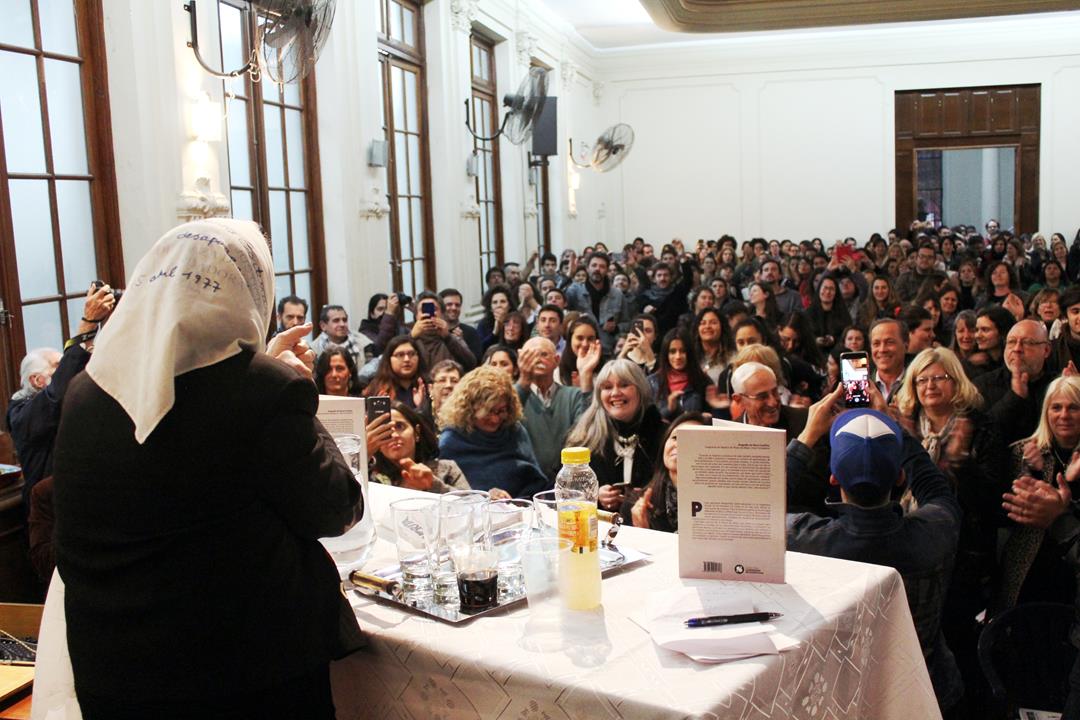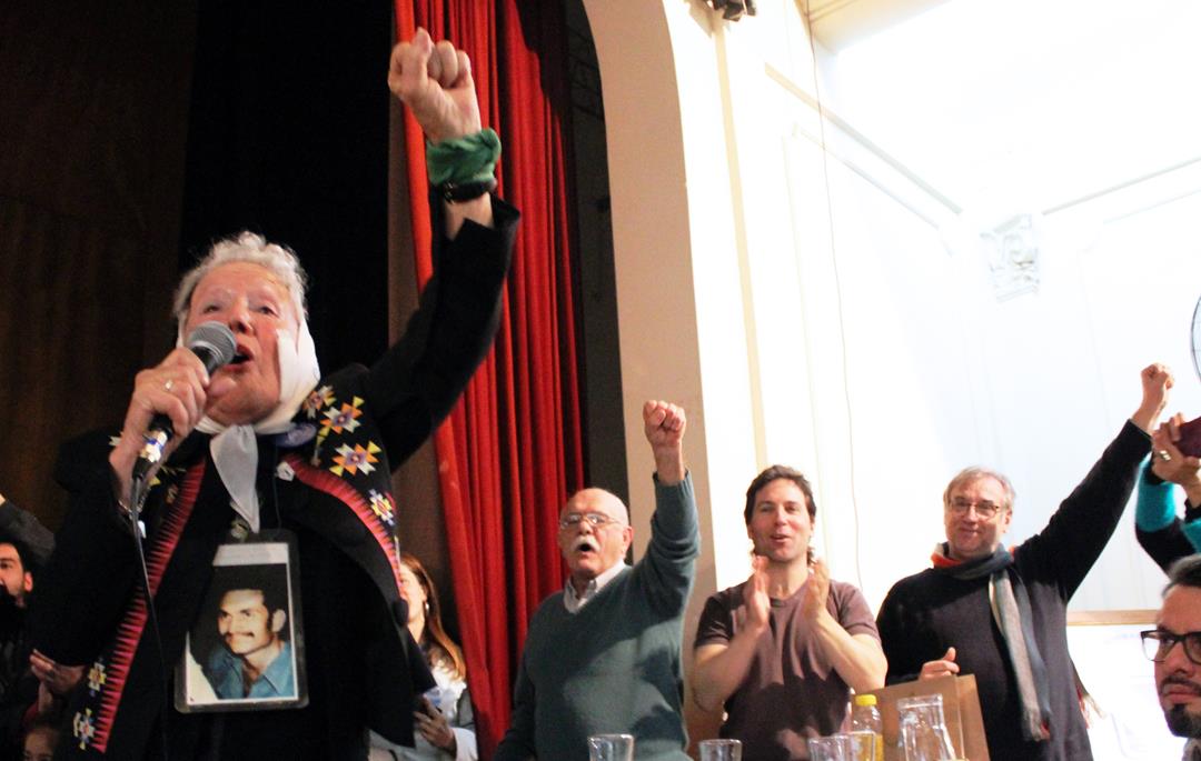 Cortiñas hablará una hora, parada, con cientos de miradas emocionadas posadas sobre cada gesto y palabra. Nadie se corre de su silla o lugar en el piso. Ella se mueve, no se ahorra ningún chiste ni definición. Levanta el puño en alto y nunca deja de sonreír, tampoco cuando se limita en algunos temas porque no quiere llorar. Tras el cierre del acto formal, cerca de las 21.00 horas, empieza a firmar libros. Hay una fila de 70 personas. A cada una la recibe como si fuera lo primero que hace en el día, la mira, le comenta una anécdota, escucha sus palabras. Y, así, la mujer de casi 90 años estampa su sello en cada ejemplar.