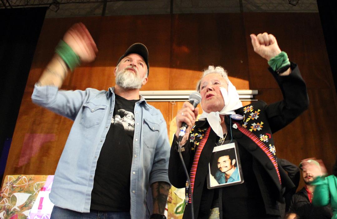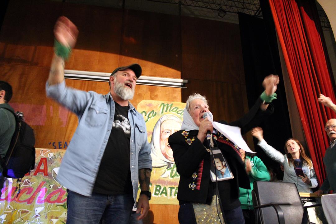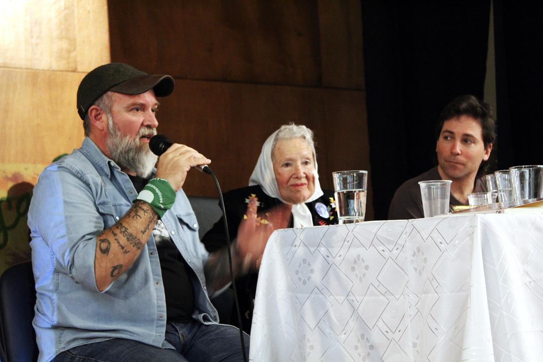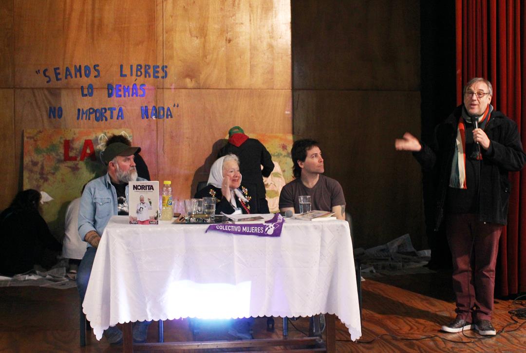 Esta vez pudieron coincidir en la presentación de la biografía ‘Norita: la madre de todas las batallas’, su autor, Gerardo Szalkowicz, Norita y Sergio Maldonado, hermano de Santiago. Las dinámicas de esta mujer con ambos merecerían otra nota, dado que la complicidad, el afecto y el respeto mutuo, encandilan. Mientras diversas personas y grupos dan su saludo, artistas rosarinos de Arte por Libertad bocetan los trapos que pintarán a lo largo del encuentro.