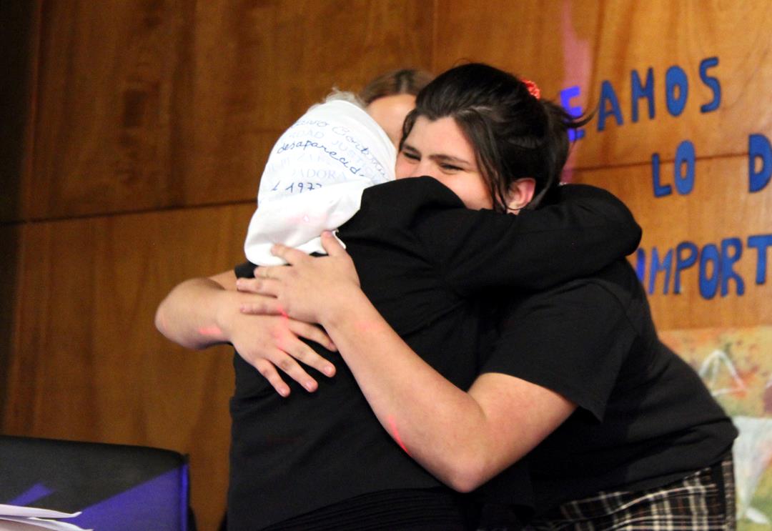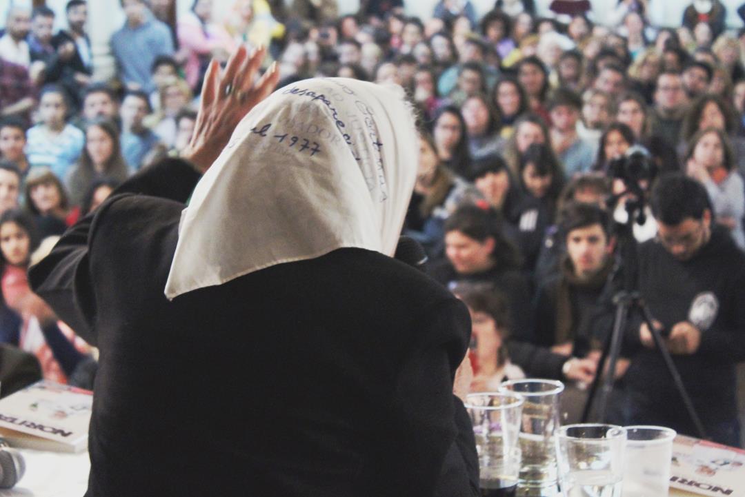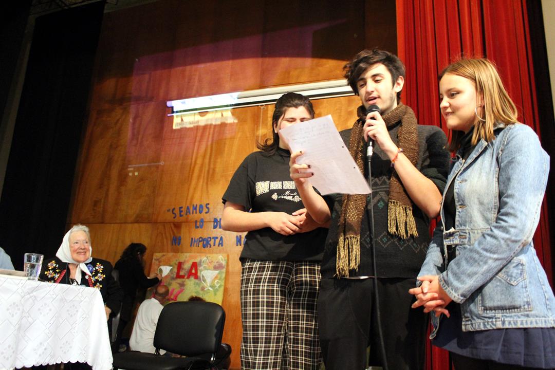 El acto es conducido por el Secretario General de la CTAA y Amsafe Rosario, Gustavo Terés, quien define que estamos ante “una madre de las plazas públicas, en una escuela pública”. Sosteniendo una hoja temblorosa y la voz de a ratos quebrada de la emoción, estudiantes del Normal 2 aseguran que se sienten “hermanos de los compañeros y compañeras desaparecidas, peleamos contra el mismo gigante. Cuando la historia parece que se repite nos queda hacer memoria, organizarnos y luchar”. Cortiñas, los escucha atenta y les ofrenda una sonrisa y abrazo largo cuando terminan de hablar.