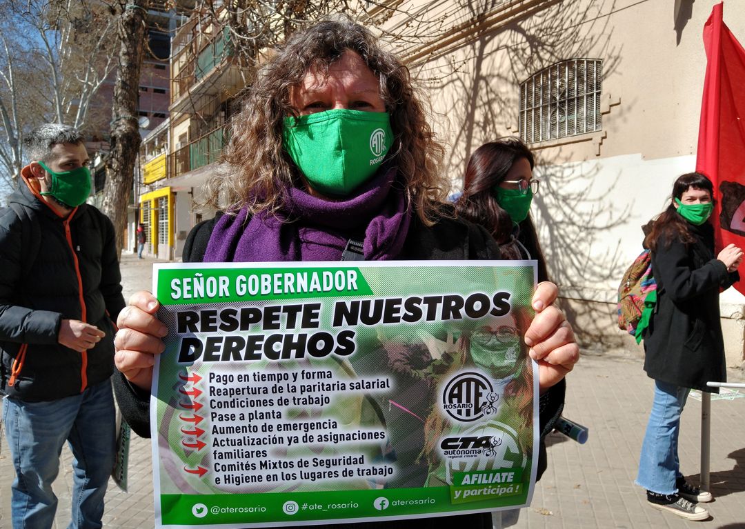 En su paro de 48 horas, ATE Rosario protestó en tres espacios distintos. Frente a la Municipalidad, reclamó el pase a planta de 30 trabajadores y trabajadoras que están desempleados desde el año pasado. Luego, se trasladaron a la protesta unitaria donde exigieron paritaria nacional en Salud, entrega de elementos de protección personal en cantidad y calidad. Finalizaron en las puertas de Desarrollo Social de la Provincia, “el Ministerio con más precarización laboral de Santa Fe”, con 1200 personas en esa situación.