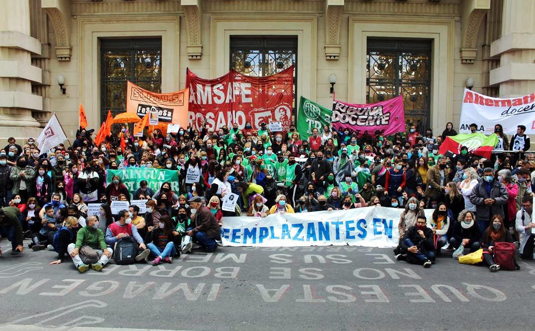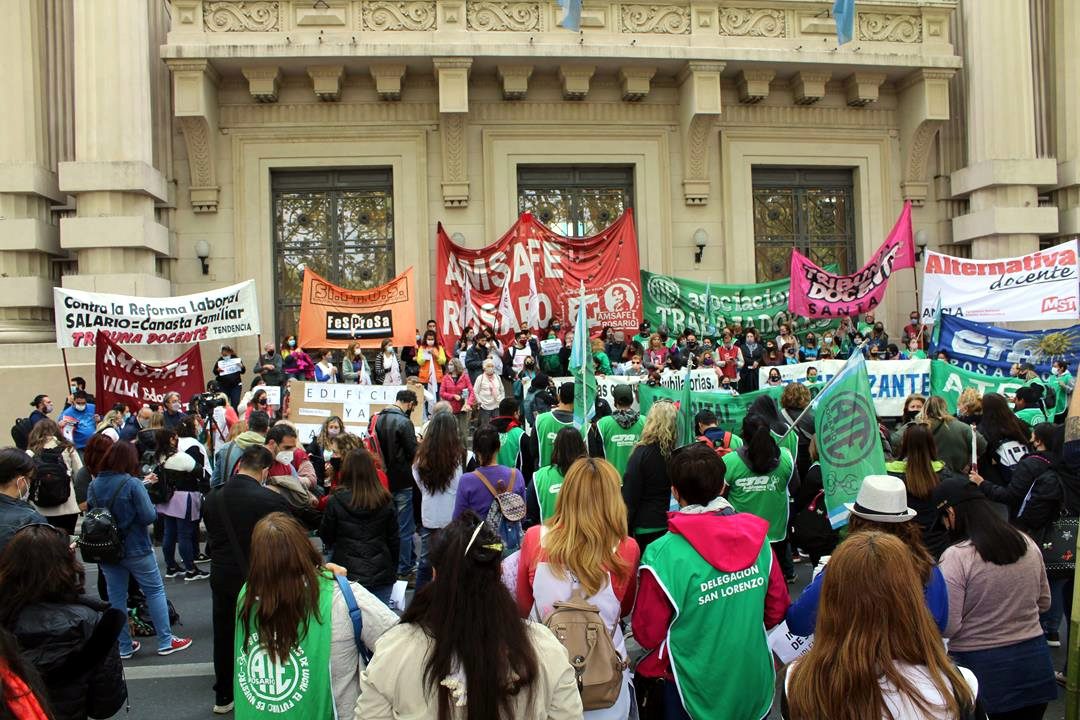 Con discursos muy críticos al gobierno de Omar Perotti y al rol de aquellas direcciones provinciales de los sindicatos que se sientan en las paritarias sin respetar sus mandatos de base, diversas representaciones gremiales tomaron la palabra. Lo hicieron después de ‘correr’ un sorpresivo cordón policial que se apostó bajo la escalera de Gobernación, histórico escenario de los actos.