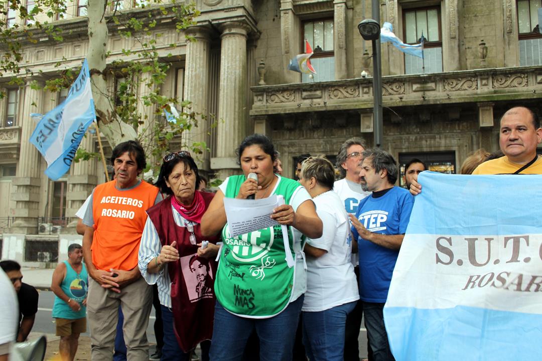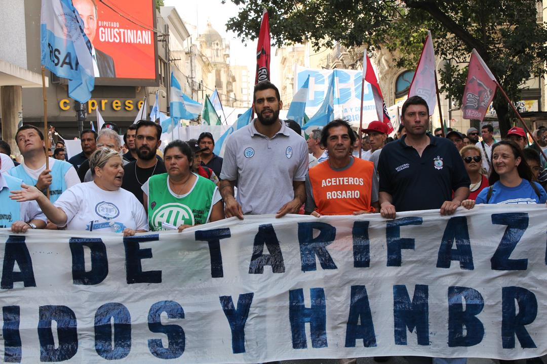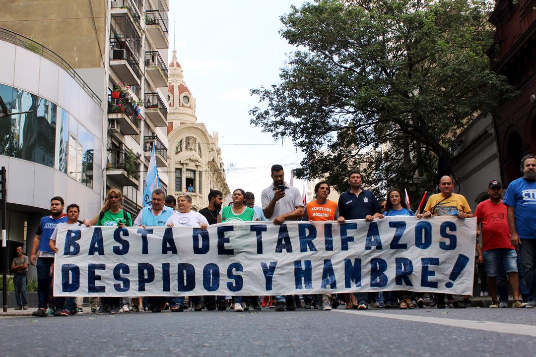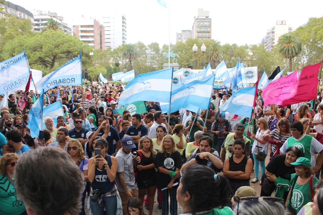 La movilización fue al encuentro de docentes y estatales, que se abrazaron al grito de “unidad de los trabajadores y al que no le gusta se jode”, mientras se levantaba un viento tormentoso que apuró el acto pero no acalló los reclamos de organizaciones sindicales y sociales unificadas. “O rompemos con el FMI o el FMI rompe el país, si cada 100 pesos de presupuesto 30 son para pagar deuda, 9 para educación y 2 para ciencia y técnica, estamos muy mal. El daño social, económico, político y cultural que se le está haciendo a nuestro pueblo es tremendo”, expresó el Secretario General de la CTAA Rosario y de AMSAFE Rosario, Gustavo Terés.