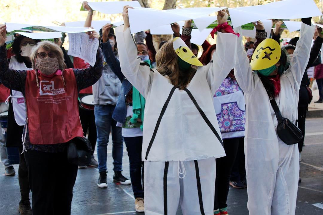 En ambas ciudades se concentró frente a la sede de Gobernación y se expresó el mismo pliego reivindicativo: la reincorporación inmediata de todo el personal cesanteado, pase a planta, reapertura de paritarias, aumento de emergencia para efectivos y precarizados por igual, salario de emergencia para reemplazantes, pago de deudas, elementos de Protección Personal para el personal abocado a la pandemia, etcétera. También hubo asambleas en efectores de salud de Rosario y el Cordón Industrial.