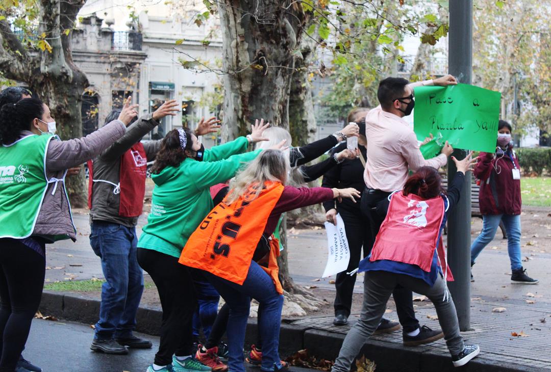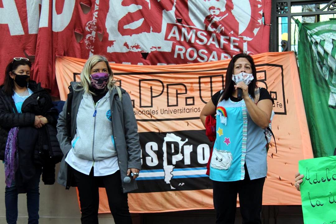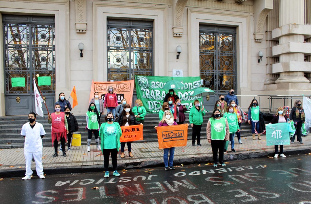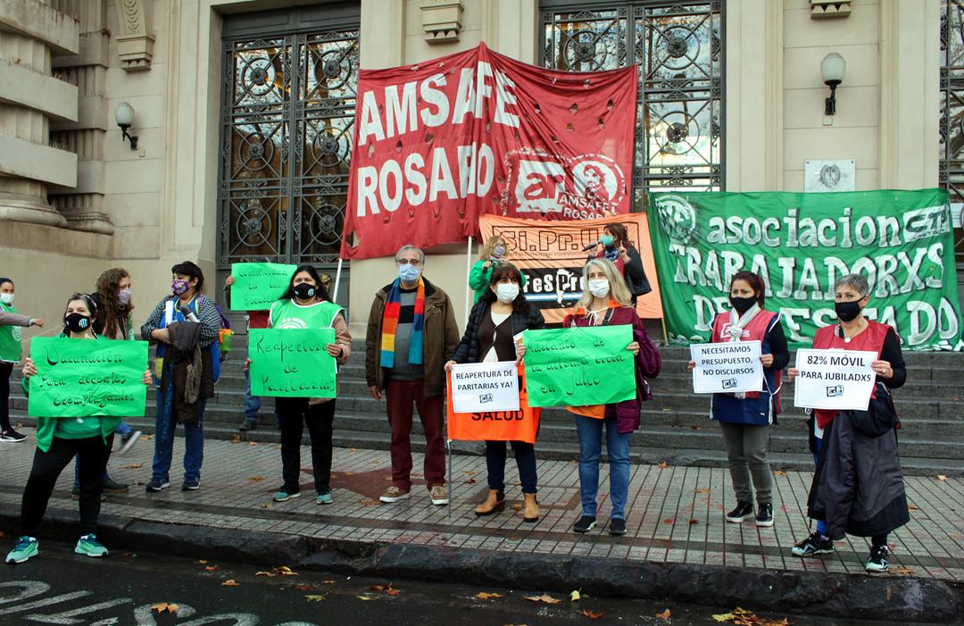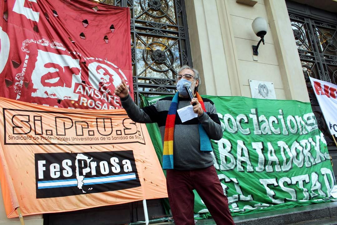 La intervención frente a la sede de Gobernación fue en el marco de un paro de 24 horas de la Seccional Rosario de ATE, una desobligación de 10.30 a 14.30 horas de Amsafe local y una jornada nacional de la federación que nuclea a profesionales de la salud enrolados en SIPRUS.