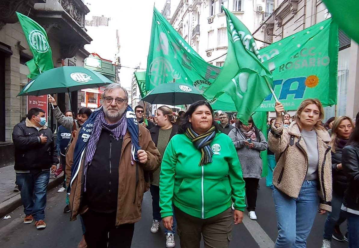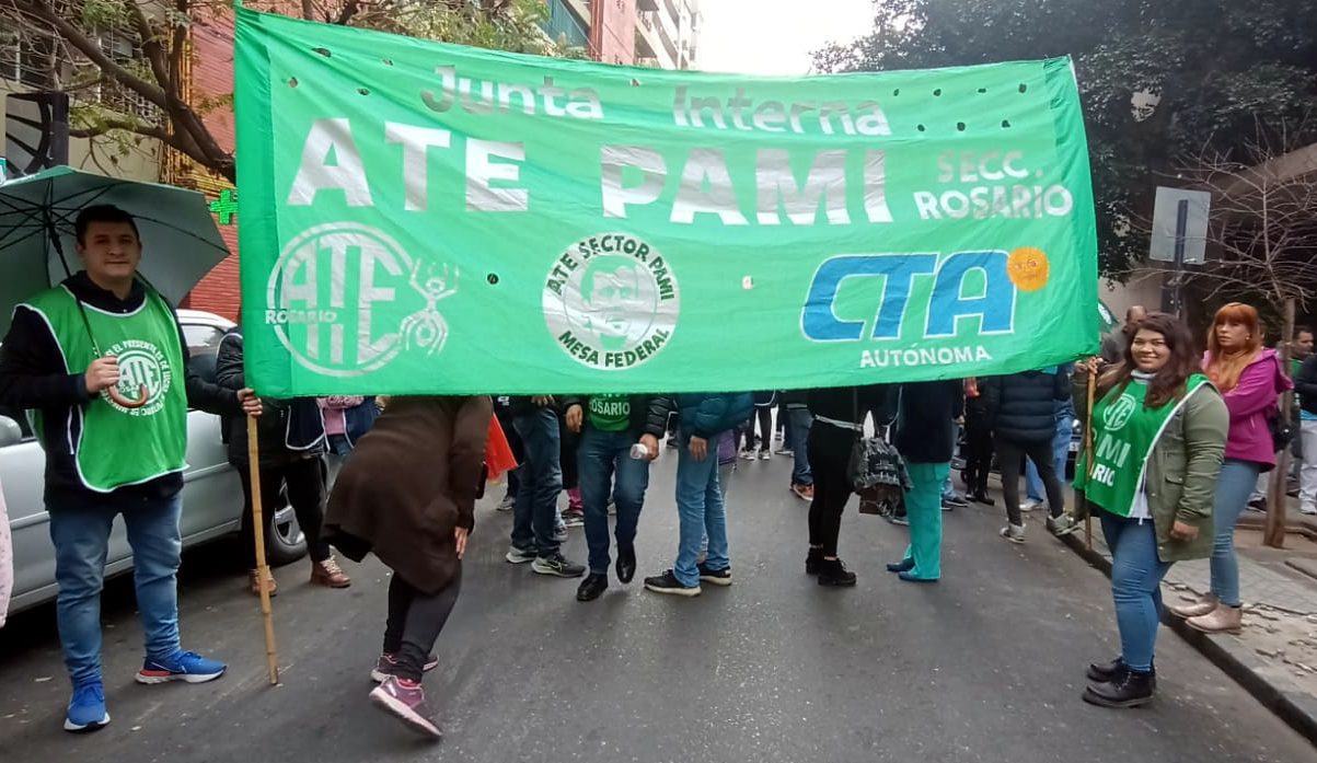 El miércoles la Junta Interna de ATE Rosario en PAMI había iniciado un paro por 48 horas (con sostenimiento de guardias mínimas), en continuidad del reclamo por pase a planta, fortalecimiento de efectores propios, recuperación de capitas, sistema de traslados propio y eficiente. Este mediodía una colorida columna del gremio estatal y la CTA Autónoma, volvió a recorrer el microcentro para ‘cuidar la salud de las y los jubilados, defendiendo en sintonía los derechos de las y los trabajadores’.