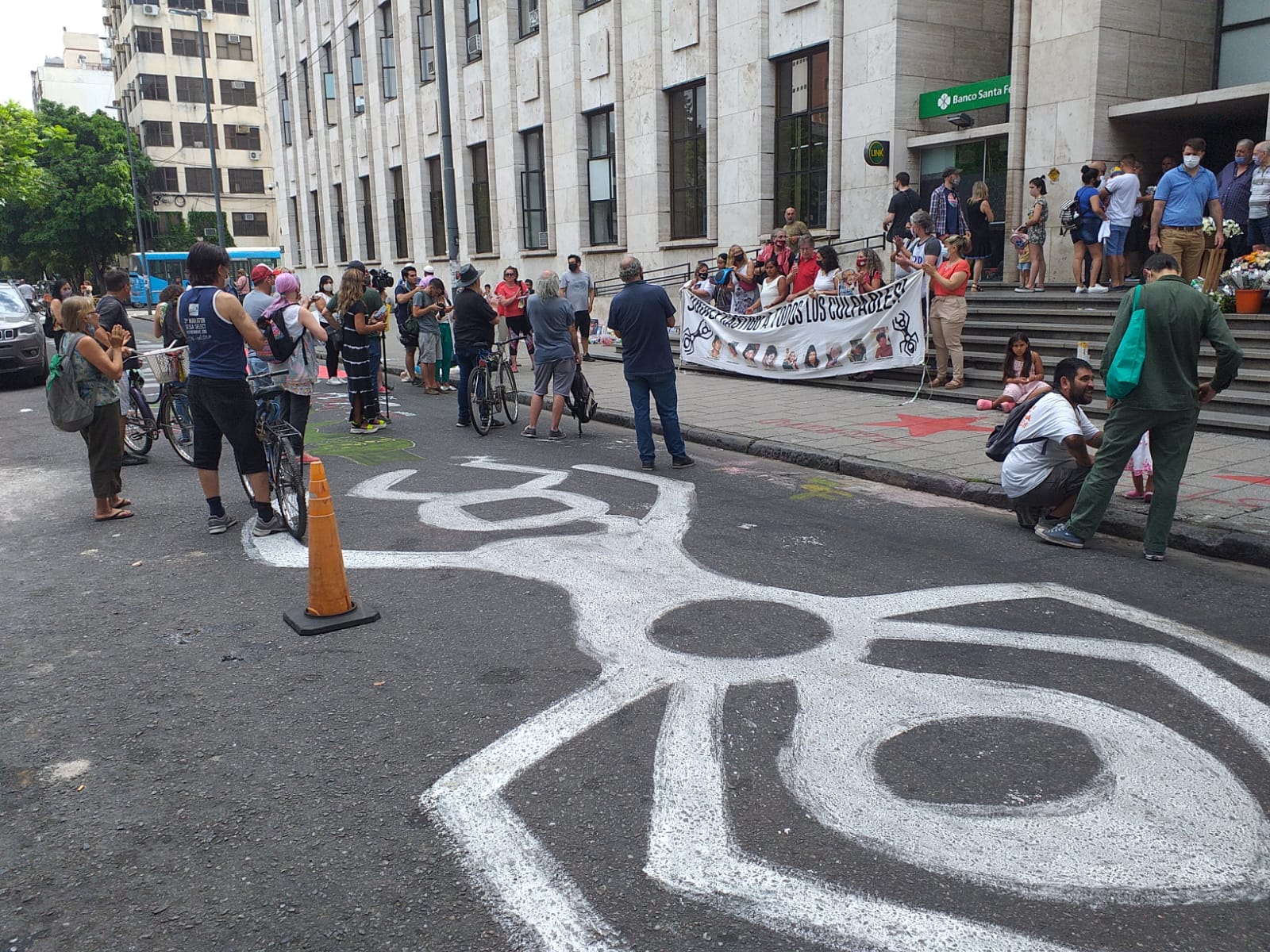 Sacando fotos, saludando, abrazando, anda ‘la Cele’, hermana de Claudio e integrante de la Asamblea 19 y 20 de familiares. Un espacio que desde el dolor parió contención, lucha, dignidad y, como dicen siempre ‘construcción de justicia colectiva, contra esa que niegan los pasillos de Tribunales’. También estaban coloreando las calles con los reclamos, plasmando las luchas como hace veinte años, las y los compañeres de Arte x Libertad, grupo de artistas plásticos populares que desde 2001 son el testimonio cultural vivo de la pelea.